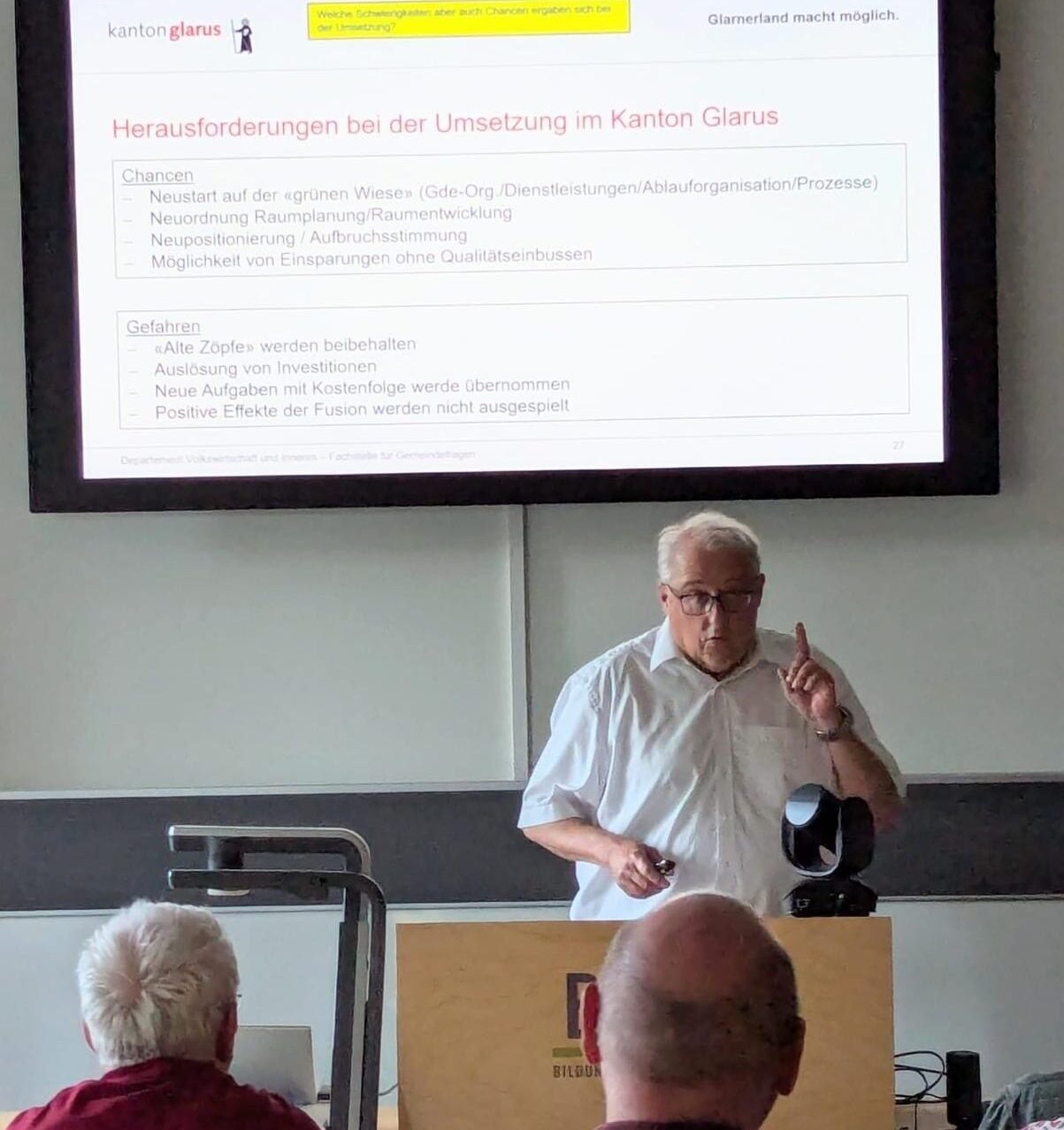 Hansjörg Dürst referiert über die Erfahrungen nach der radikalen Glarner Gemeindefusion (Bild: Christoph Mühlhäuser, GLP)