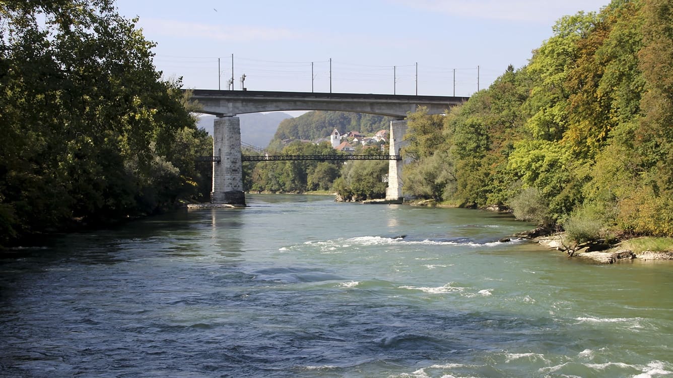 Die Aareschlucht bei Brugg. Im Hintergrund die Eisenbahnbrücke der Bözberglinie sowie Umiken.