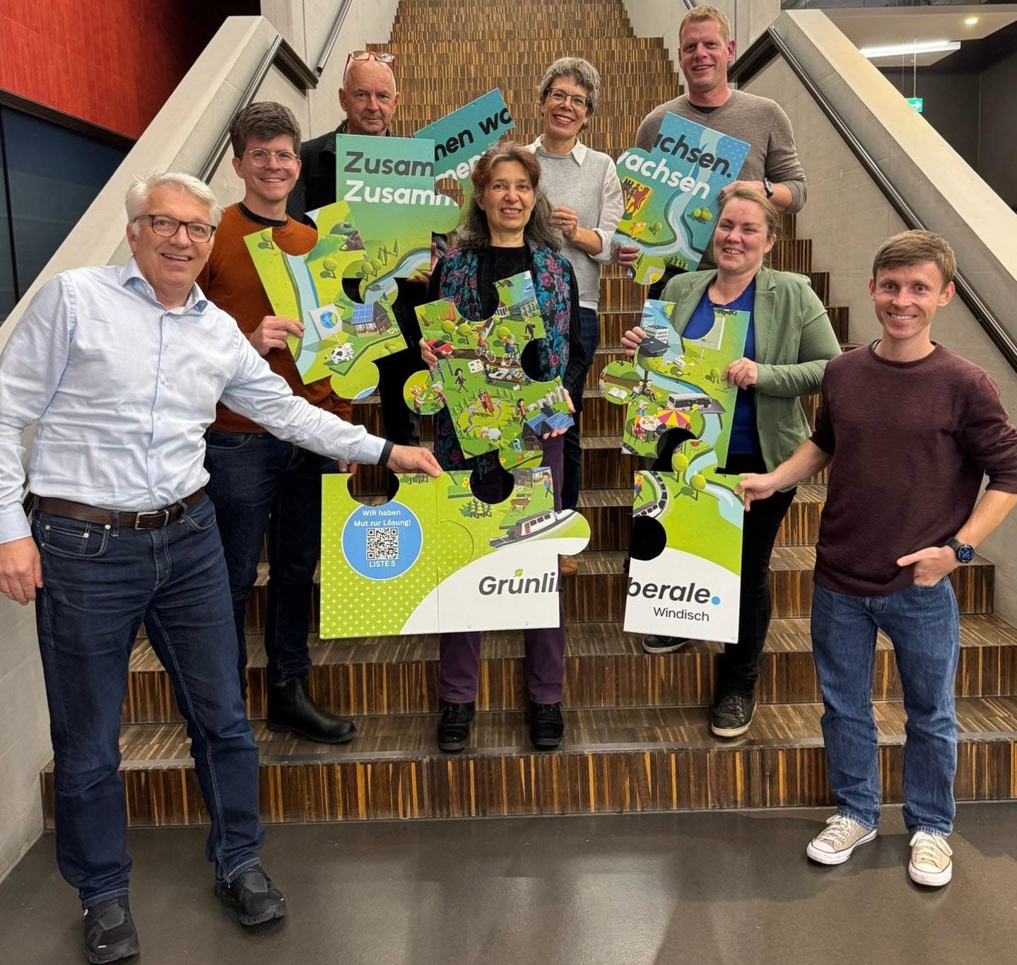 Mit einem kreativen Symbolbild startet die GLP Windisch in die Wahlzeit 2025. Neun Kandidatinnen und Kandidaten bewerben sich um die Sitze im Einwohnerrat. Sie alle halten jeweils ein Puzzleteil in den Händen – gemeinsam ergeben sie das Wimmelbild des Wahlplakats.