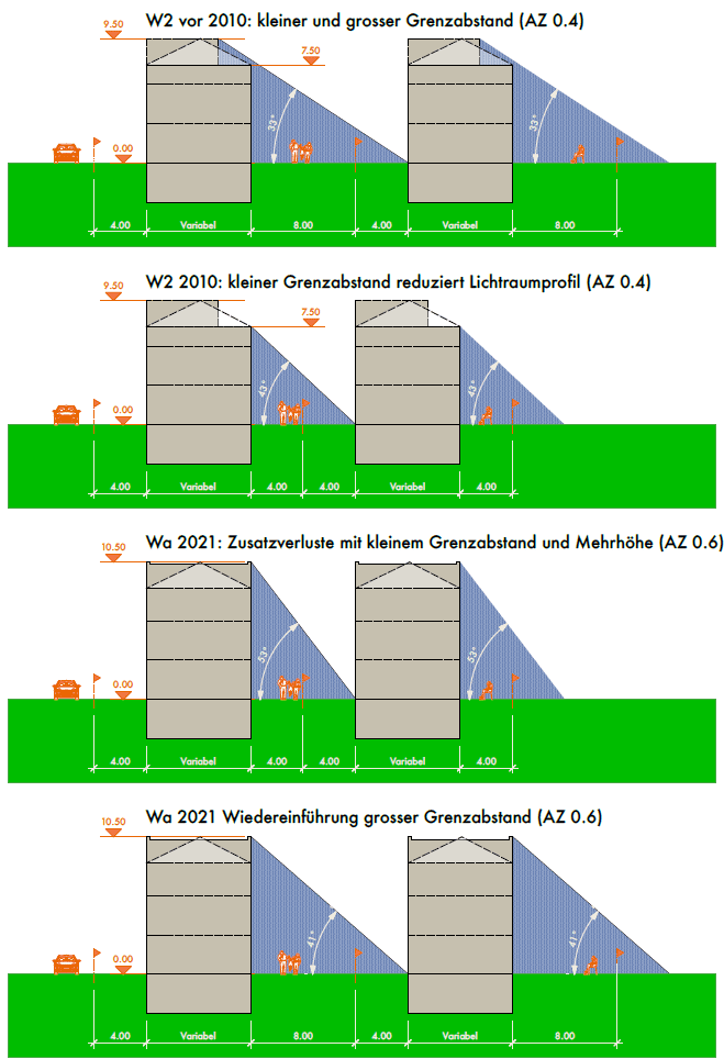 Heikel wird dies vor allem dort, wo exzessive Aufzonungen vorgesehen sind und neue dichte Zonentypen geschaffen werden (z.B. in der Wohnzone Wc). Wenn dann noch die grossen Grenzabstände – die mit der jetzt gültigen Bauordnung gegenüber der Vorversion bereits «geschleift» wurden – in den Wohnzonen Wa und Wc völlig entfallen, aber parallel dazu ein Aufwuchs zu Vollgeschossen mit zusätzlichen Gebäudehöhen ermöglicht wird, entstehen fragwürdige und vor allem schlecht besonnte und wenig nutzbare Zwischenzonen zwischen den Bauten (siehe Grafik). Mit der Grünflächenziffer allein kann eine genügende Besonnung und Durchgrünung der Gebäudezwischenräume nicht sichergestellt werden.